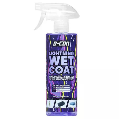 D Con Lightning Wet Coat bietet eine Lösung für alle, die mühelos Glanz & Schutz für Glas-, Lack- und Kunststoffoberflächen suchen. Dank seiner Formel mit einem hydrophoben Finish verleiht es Deinen Oberflächen sofortigen Glanz und eine beeindruckende wasserabweisende Wirkung.