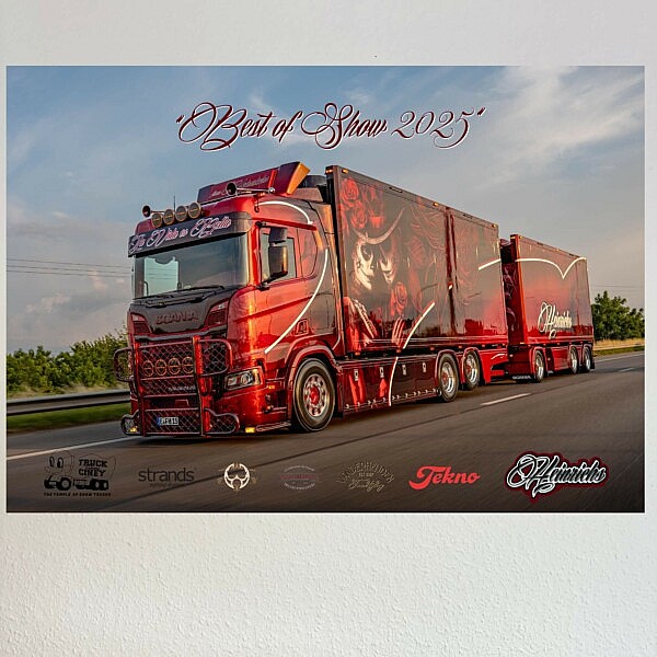 Dieses exklusive Poster zeigt den legendĂ€ren HEINRICHS HĂ€ngerzug „La Vida es Bella“, der auf der Truck Show Ciney 2025 mit dem